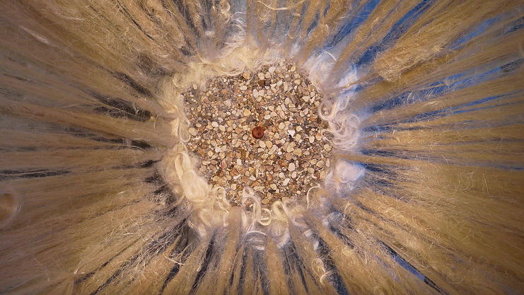 Materiais: Fibra de sisal cardada, seixos de rio, moringa.